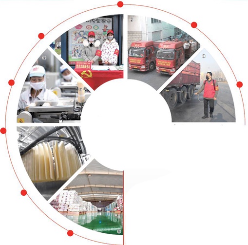 ①门岗对进入公司的货车消毒。②客栈大年头二最先发货。③党员自愿者组成服务队。④工厂车间生产一角。⑤自动化烘干生产线。⑥整齐…